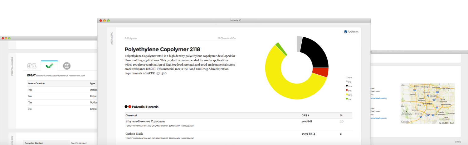 No other resource provides compliance information at the chemical, mixture or material level. Easily verify if more complex assembly or finished products meet third party requirements such as REACH, RoHS, LEED or EPEAT.